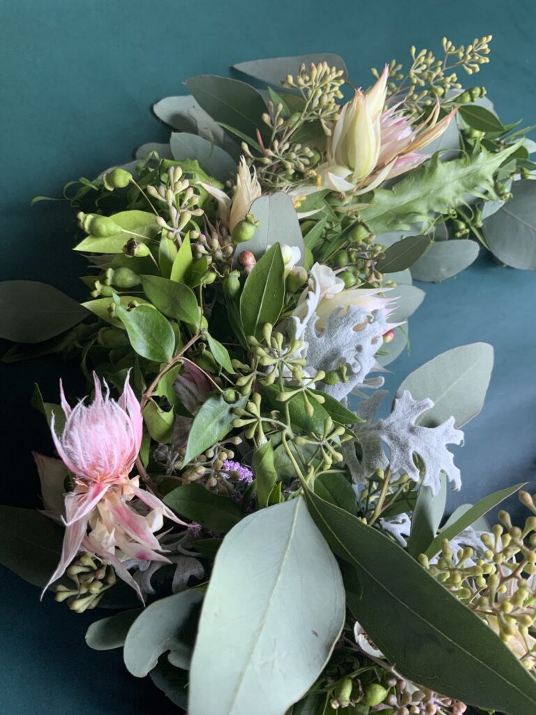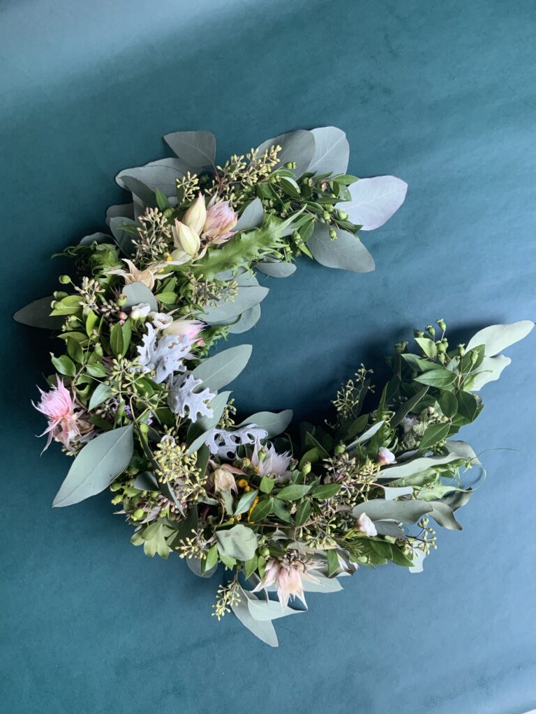ユーカリ、ギンコウバイ、アセビなどのグリーンと花はセルリアをメインに三日月完成⭐︎