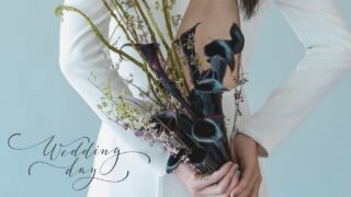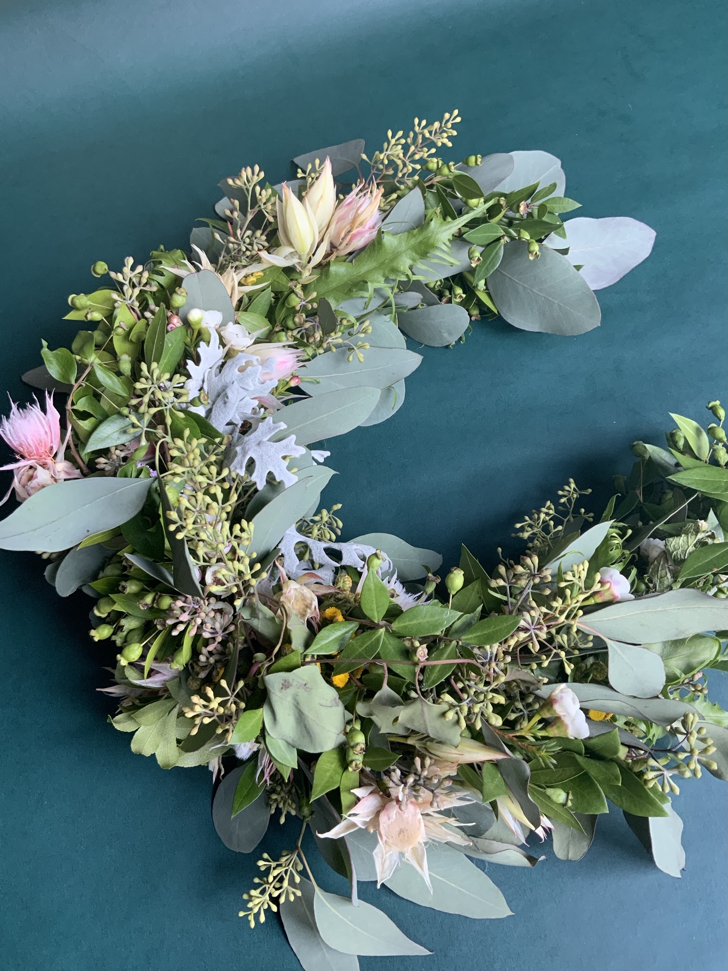 ユーカリ、ギンコウバイ、アセビなどのグリーンと花はセルリアをメインに三日月完成⭐︎