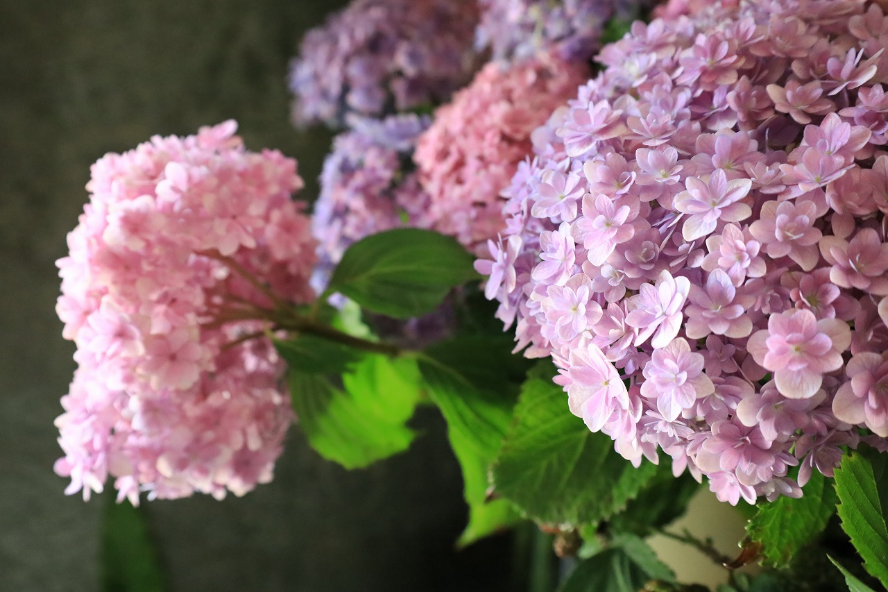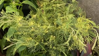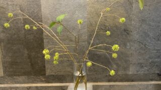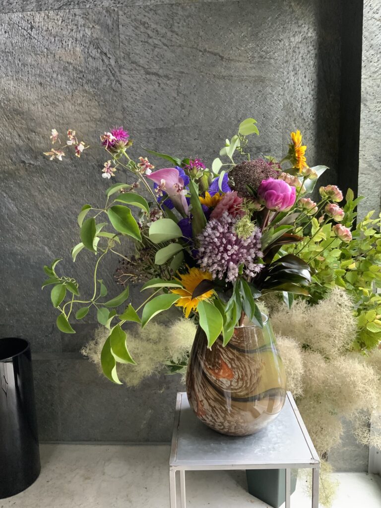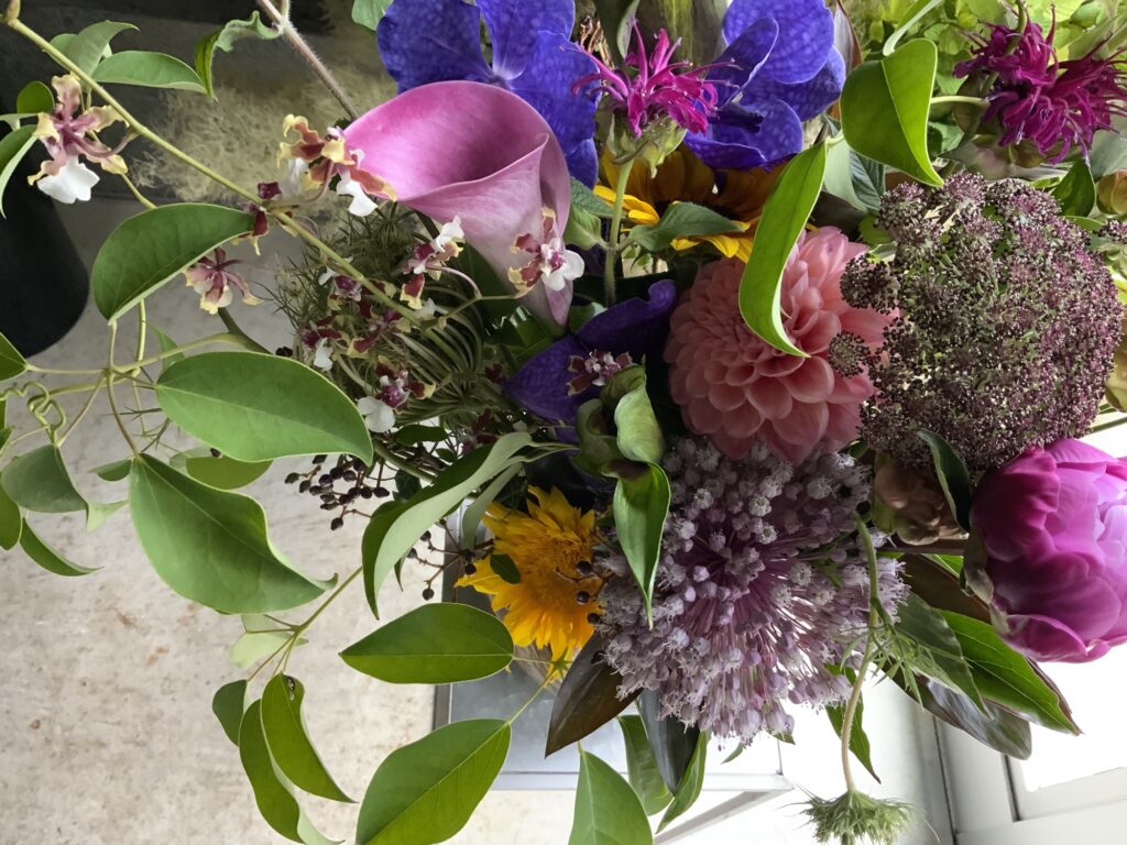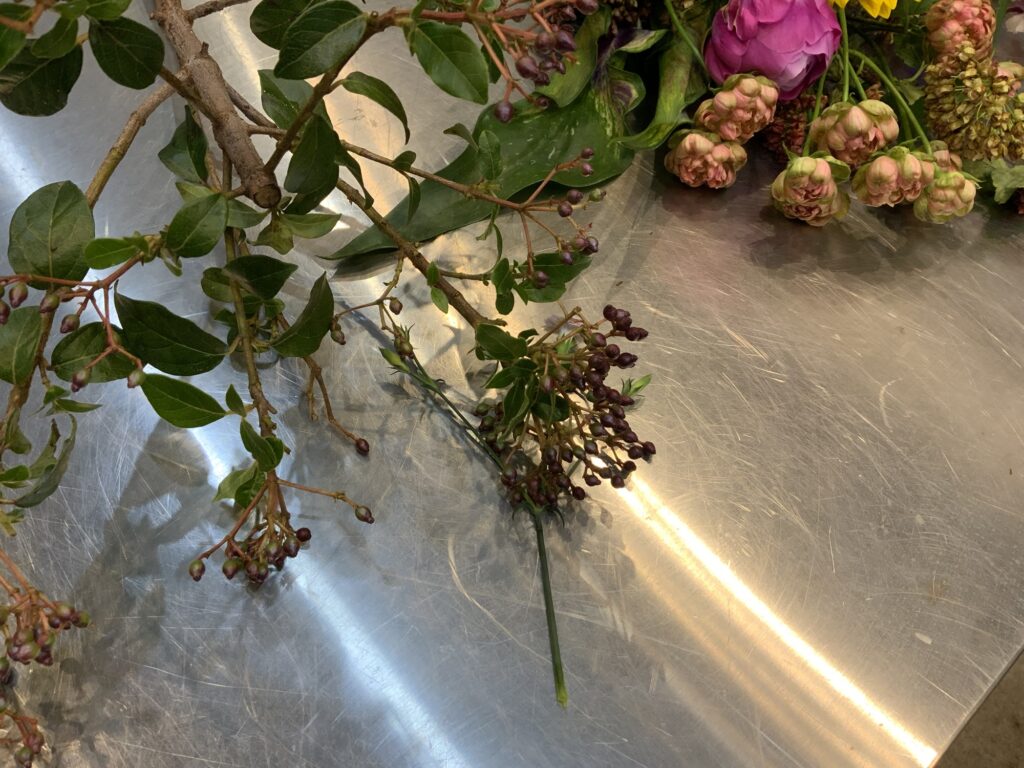 香りの良いオンシジュームと郁子の葉で動きを出して